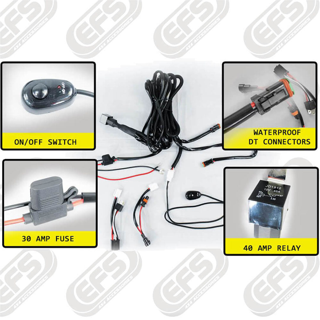 Install your EFS Vividmax light bar or spotlight with the Vividmax Wiring Loom Kit. This kit includes wiring, a cool switch, a fuse to protect your circuit and a 40 amp relay to switch it all on.